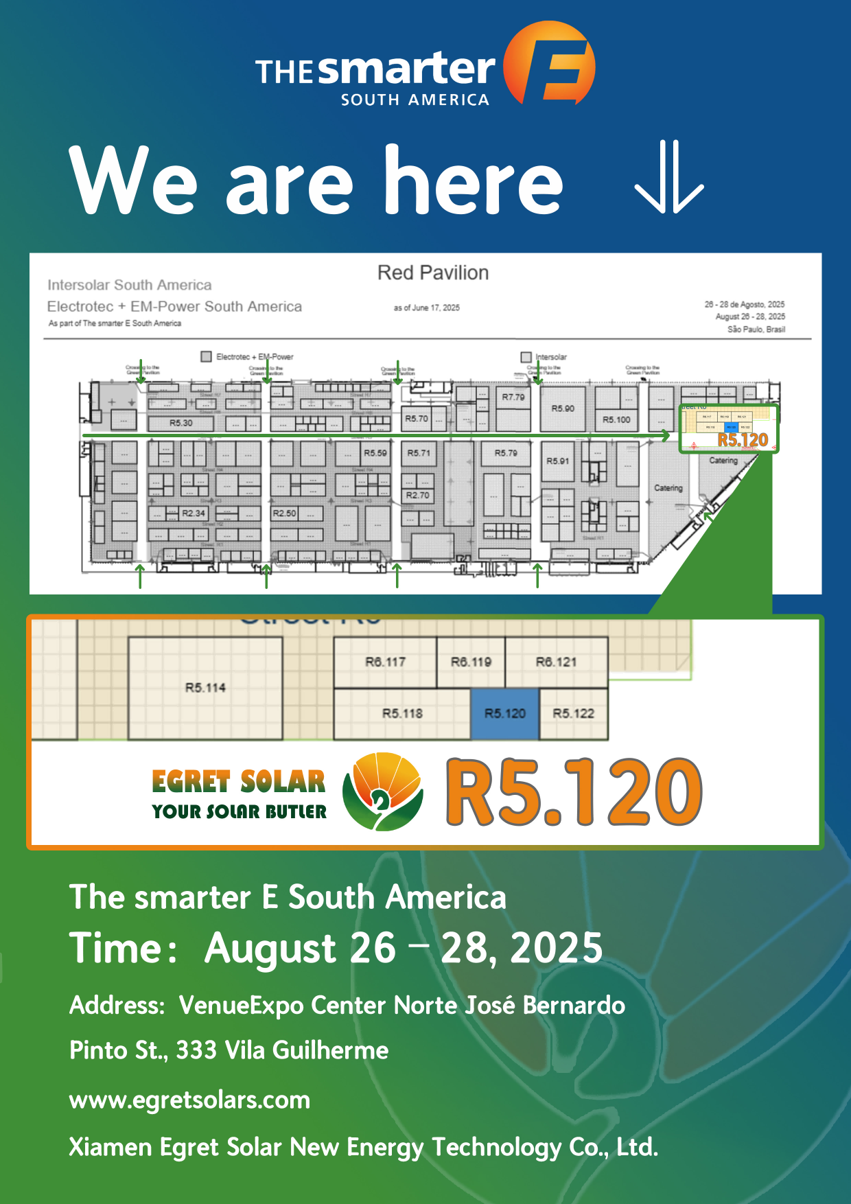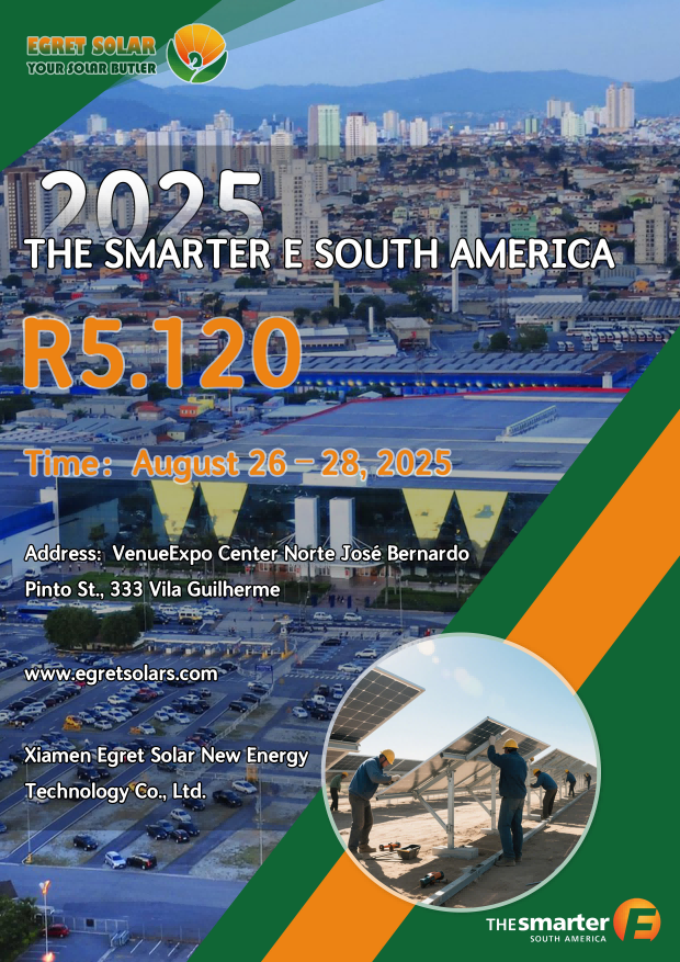 Som en nøkkelaktør i den nye energisektoren,Xiamen Egret Solar New Energy Technology Co., Ltd.vil vise frem sine kjerneprodukter og tekniske løsninger på Smarter E South America 2025-utstillingen i Brasil fra 26. til 28. august 2025, for å diskutere utviklingen og samarbeidet fra det søramerikanske nye energimarkedet med globale bransjepartnere.