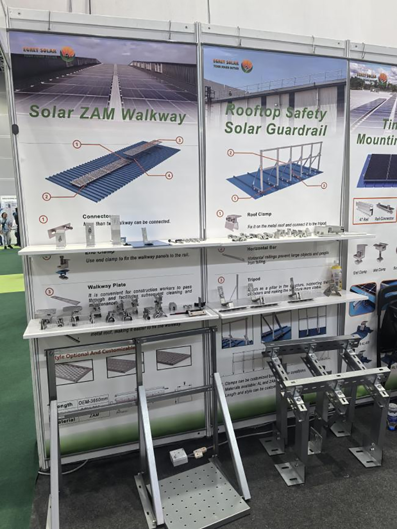 På utstillingen viste vi frem flere taktilbehør, inkludert klemmer, kroker og L-føtter. Kunder kan velge ulike kombinasjoner basert på deres installasjonsmiljø. Klemmer eller L-føtter brukes til fargebelagte stålfliser, mens taksteinkrok solar brukes til keramiske fliser. Vi kan også tilpasse klemmer basert på kundens fargebelagte stålflismodell eller forlenge krokens arm for å passe til bruk på stedet.
