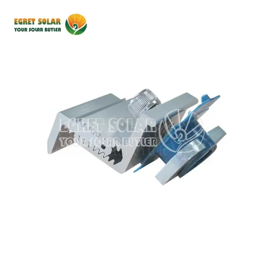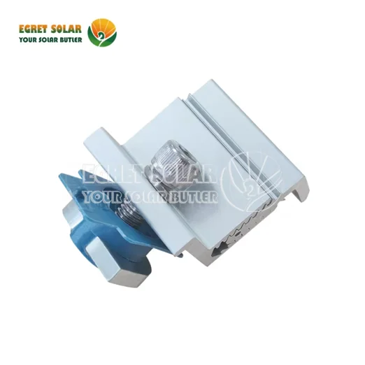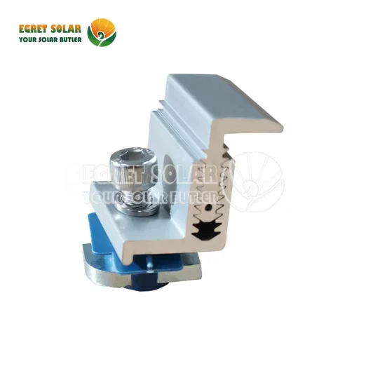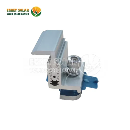 Egret solcellepanel endeklemme Justerbar for C stålbane brukes i endene av solcellepaneler for å forhindre at de løfter av monteringsskinnene i høy vind eller tunge snøbelastninger. De brukes også til å sikre solcellepaneler til monteringsskinnene i endene av solcellepanelets matriser. Endeklemmen strammer seg med den ene hånden for en enkel, sikker tilkobling ved å trekke kabelbånd gjennom en spalte i platene.